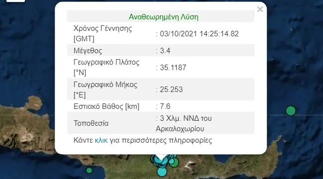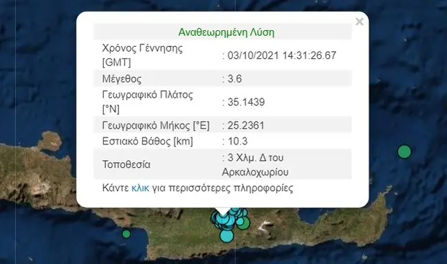Συνεχίζονται οι μετασεισμικές δονήσεις στην Κρήτη. Συγκεκριμένα, μέσα σε έξι λεπτά καταγράφηκαν δύο διαφορετικές σεισμικές δονήσεις με επίκεντρο το Αρκαλοχώρι. Η πρώτη σημειώθηκε στις 17:25 το απόγευμα και σύμφωνα με το Γεωδυναμικό Ινστιτούτο ήταν εντάσεως 3,3 Ρίχτερ, ενώ η δεύτερη στις 17:31 μ.μ. με ένταση 3,6 βαθμών της κλίμακας Ρίχτερ. Και οι δύο δονήσεις είχαν επίκεντρο περιοχή νοτιοδυτικά του Αρκαλοχωρίου και εστιακό βάθος στα πέντε χιλιόμετρα. Οι δονήσεις έγιναν αισθητές μέχρι και το Ηράκλειο.