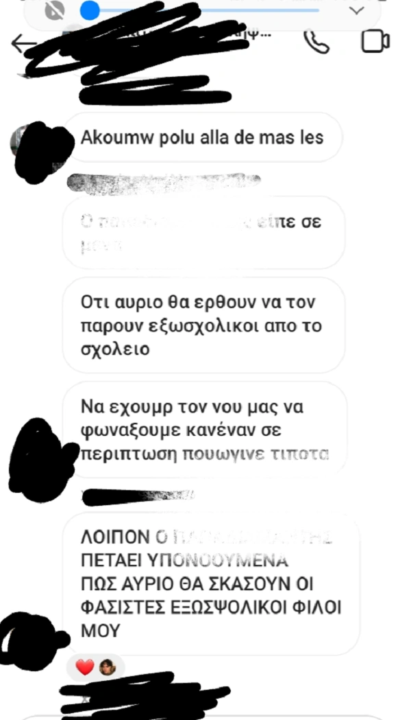 Σε συνομιλίες στο Instagram, διαπιστώνεται σύμφωνα με τα σωματεία, πως μαθητής δέχτηκε επίθεση εντός του σχολείου επειδή ήταν μέλος της ΚΝΕ. Μάλιστα, το Εργατικό Κέντρο Θεσσαλονίκης έδωσε στη δημοσιότητα και φωτογραφία στην οποία απεικονίζονται σταγόνες αίματος με το μήνυμα «σαπίσαμε στο ξύλο μαθητή που καταλάβαμε ότι ήταν μέλος της ΚΝΕ». Παράλληλα ο κ. Τσιαούσης σημείωσε πως «όλες τους οι επιθέσεις και αυτές της προηγούμενης εβδομάδας και η χθεσινή σε μέλη του ΚΚΕ και της ΚΝΕ ήταν ταχύτατες, καταδρομικού χαρακτήρα, με δολοφονικά εργαλεία».