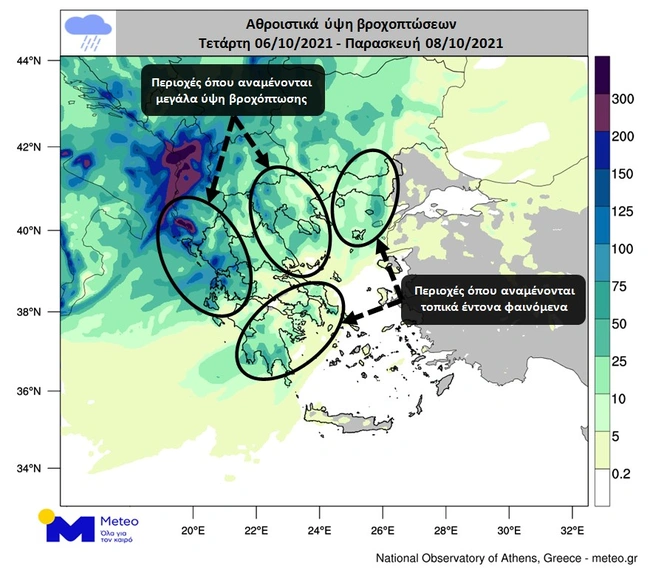 Στον προγνωστικό χάρτη που ακολουθεί παρουσιάζονται τα εκτιμώμενα αθροιστικά ύψη υετού (βροχές/ καταιγίδες) έως τις βραδινές ώρες της Παρασκευής 8 Οκτωβρίου.