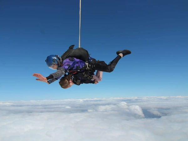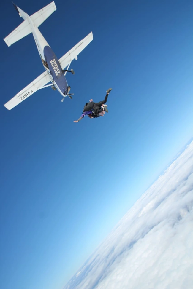 «Έχοντας ντυθεί με τον κατάλληλο εξοπλισμό, επιβιβαστήκαμε στο ειδικό αεροπλάνο, όπου και δέθηκα πάνω στο σώμα του κ. Σουρλή. Η εμπειρία μέσα στο ίδιο το αεροπλάνο ήταν αρκετά διασκεδαστική καθώς η απογείωση και η πτήση είναι πιο έντονη από τις αντίστοιχες ενός συμβατικού αεροσκάφους. Μέχρι τη στιγμή που βρίσκεσαι πάνω από τα σύννεφα, έχεις φτάσει στα 14000 πόδια και ανοίγει η πόρτα και αντικρίζεις τα σύννεφα και το κενό. Εκεί, για να είμαι απόλυτα ειλικρινής, η θέα μού προκάλεσε δέος και φόβο ταυτόχρονα. Πέρασε από το μυαλό μου μήπως θα έπρεπε να κάνω πίσω και να μην πηδήξω. Ευτυχώς, αυτή η σκέψη όμως δεν κράτησε πολύ και υπερίσχυσε η τόλμη», περιγράφει με γλαφυρό τρόπο η τελειόφοιτη φοιτήτρια βιολογίας του ΑΠΘ και συνεχίζει να ξεδιπλώνει το κουβάρι των εικόνων και συναισθημάτων από τις πρώτες εκείνες στιγμές.