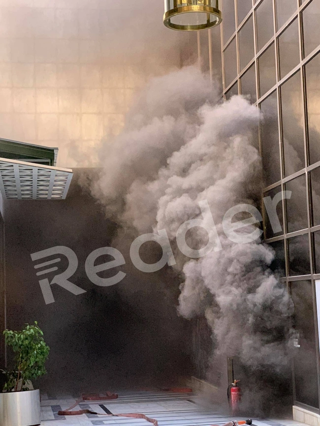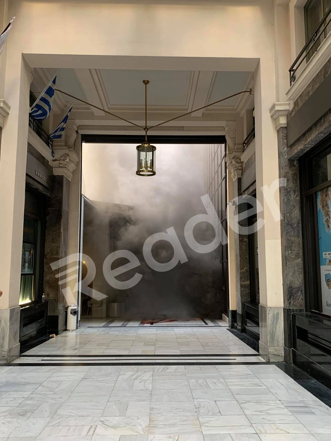Η εστία της φωτιάς δεν ήταν εμφανής από τους κεντρικούς δρόμους, όμως πυκνοί καπνοί έχουν τυλίξει την περιοχή κάνοντας αποπνικτική την ατμόσφαιρα. Σύμφωνα με την πυροσβεστική υπηρεσία ο καπνός αναβλύζει από το δεύτερο υπόγειο της τράπεζας. Οι πρώτες πληροφορίες αναφέρουν ότι η φωτιά ξεκίνησε από βραχυκύκλωμα στους μετασχηματιστές και καίγονται πλαστικά.