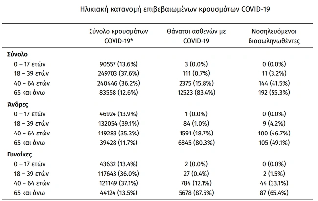 Σύμφωνα με τα επίσημα στοιχεία του ΕΟΔΥ, το 95.4% των θανάτων ασθενών με κορονοϊό είχε υποκείμενο νόσημα ή/και ηλικία 70 ετών και άνω. Ειδικότερα, από την αρχή της πανδημίας έχουν χάσει την ζωή τους 12.523 άτομα άνω των 65 ετών, αριθμός που αντιστοιχεί στο 83,4% των συνολικών θανάτων ενώ στη συγκεκριμένη ηλικιακή ομάδα έχουν επιβεβαιωθεί 83.558 κρούσματα ή αλλιώς το 12,6% των συνολικών κρουσμάτων. Στην ηλικιακή κατηγορία 40 – 64 ετών έχουν καταγραφεί 2.375 θάνατοι, ποσοστό 15,8% των συνολικών θανάτων και 240.446 κρούσματα. Οι θάνατοι σε ασθενείς μεταξύ 18-39 ετών είναι 111 ενώ σε αυτές τις ηλικίες εντοπίζεται το μεγαλύτερο ποσοστό νοσήσεων. Οι απώλειες παιδιών και ανηλίκων από επιπλοκές του κορονοϊού είναι 3 με περισσότερα από 90.000 κρούσματα να έχουν διαγνωστεί στην κατηγορία 0 – 17 ετών.