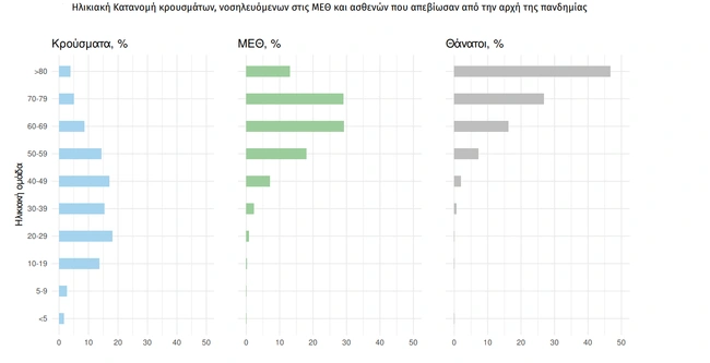 Η μέση ηλικία των ασθενών, που νοσηλεύονται αυτή τη στιγμή διασωληνωμένοι στις ΜΕΘ είναι τα 66 έτη ενώ το 79.8% έχει υποκείμενο νόσημα ή/και ηλικία 70 ετών και άνω. Μεταξύ των διασωληνωμένων είναι και 11 ασθενείς 18-39 ετών και 144, που ανήκουν στην ηλικιακή ομάδα 40-64. Η δυναμική της νόσου αποτυπώνεται στο μέσο όρο των 160 εισαγωγών το τελευταίο επταημέρου με τη μέση ηλικία των κρουσμάτων να είναι τα 39 έτη και τη μέση ηλικία των θανόντων τα 78 έτη.