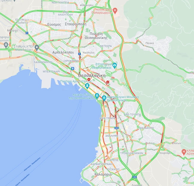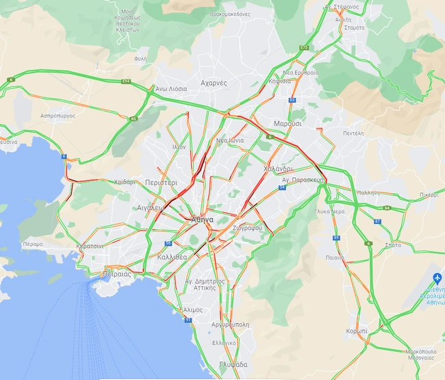 Τα μεγαλύτερα προβλήματα σημειώνονται και στα δύο ρεύματα της Αθηνών Λαμίας, όπως και στην έξοδο της Αθηνών από το Δαφνί. Αυξημένη κίνηση υπάρχει στην κάθοδο της Μεσογείων από τον Χολαργό, σε τμήματα στην κάθοδο της Κηφισίας, στην Κατεχάκη, τη Συγγρού, την Πέτρου Ράλλη από Νίκαια προς Κηφισό, στην άνοδο της Αλεξάνδρας και ακόμη στην Ηλιουπόλεως, στον Περιφερειακό του Καρέα προς την Αθήνα και στην παραλιακή στο ρεύμα προς Πειραιά.