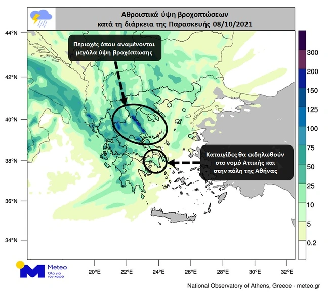 Σύμφωνα με το meteo, οι σημαντικότερες βροχοπτώσεις της ημέρας εκτιμάται ότι θα εκδηλωθούν στην κεντρική και ανατολική ηπειρωτική χώρα, στις Σποράδες, στην Ανατολική Μακεδονία, στη Θράκη, στα νησιά του βορειοανατολικού Αιγαίου και σε τμήματα της Εύβοιας. Στις περιοχές όπου εκδηλώνονται καταιγίδες συμπεριλαμβάνεται ο νομός Αττικής και η πόλη της Αθήνας. Ιδιαίτερη προσοχή συστήνεται να δοθεί στους νομούς Μαγνησίας, Λάρισας, Ημαθίας και Πιερίας, όπου οι βροχοπτώσεις εκτιμάται ότι θα έχουν μεγάλη διάρκεια. Στον προγνωστικό χάρτη που ακολουθεί παρουσιάζονται τα εκτιμώμενα αθροιστικά ύψη υετού (βροχές/καταιγίδες) έως τις βραδινές ώρες της Παρασκευής.