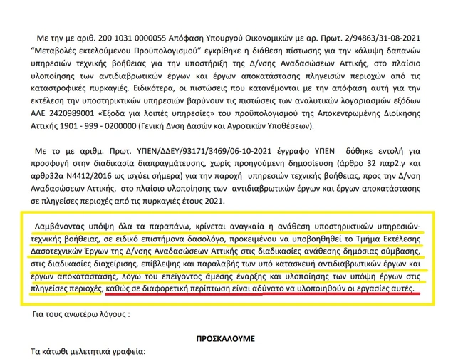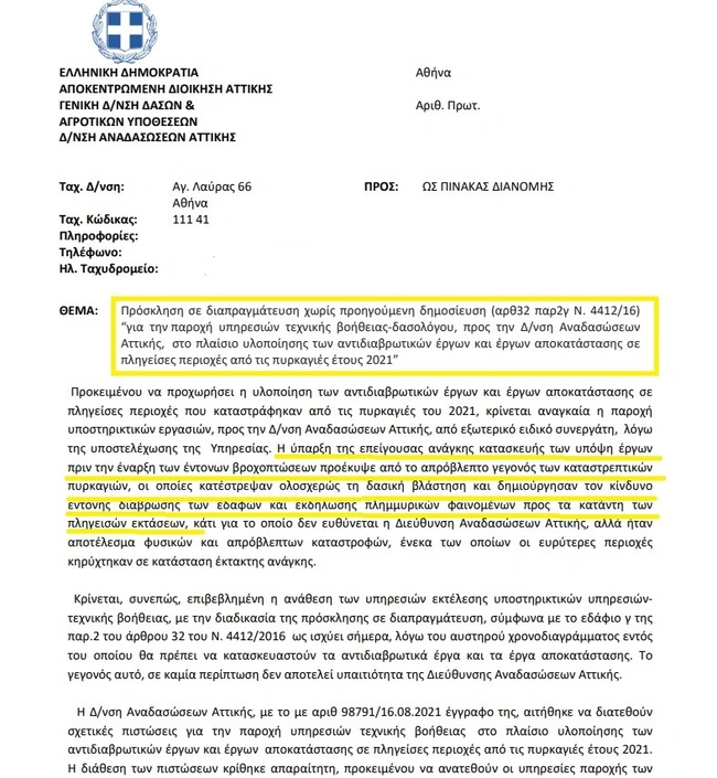 Ειδικότερα, την περασμένη Παρασκευή (08/10/2021) η Γενική Διεύθυνση Δασών & Αγροτικών Υποθέσεων Αττικής απηύθυνε πρόσκληση σε διαπραγμάτευση χωρίς προηγούμενη δημοσίευση «για την παροχή υπηρεσιών τεχνικής βοήθειας-δασολόγου, προς την Δ/νση Αναδασώσεων Αττικής, στο πλαίσιο υλοποίησης των αντιδιαβρωτικών έργων και έργων αποκατάστασης σε πληγείσες περιοχές από τις πυρκαγιές έτους 2021».