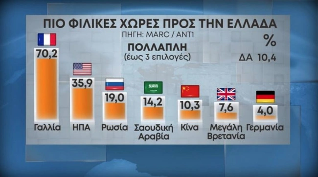 Όσο για το ποιες χώρες θεωρούνται πιο φιλικές προς την Ελλάδα το 70,2% λέει Γαλλία, το 35,9% ΗΠΑ και το 19% Ρωσία ενώ ακολουθούν Σαουδική Αραβία, Κίνα, Βρετανία και Γερμανία. Στο ερώτημα από ποιες χώρες θέλουμε επενδυτές στην κορυφή βρίσκονται και πάλι οι ΗΠΑ και ακολουθούν η Γαλλία και η Σαουδική Αραβία.