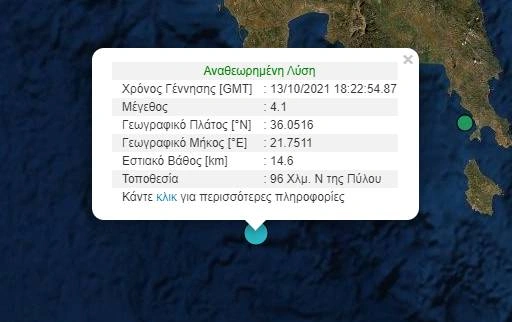 Σεισμική δόνηση 4,1 Ρίχτερ σημειώθηκε το βράδυ της Τετάρτης (13/10) ανοιχτά της Πύλου. Το εστιακό βάθος, σύμφωνα με το Γεωδυναμικό Ινστιτούτο Αθηνών, ήταν 14,6 χιλιόμετρα. Η τοποθεσία της δόνησης ήταν 96 χλμ νότια της Πύλου. Δεν υπάρχουν αναφορές για ζημιές.