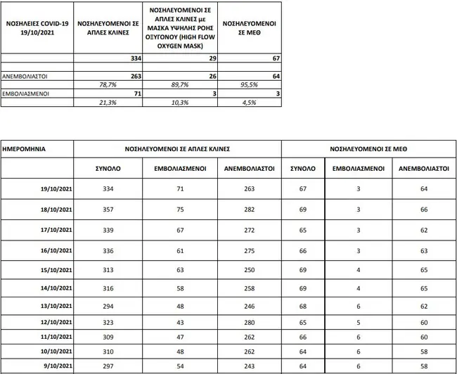 Την ίδια στιγμή μεγάλη πίεση δέχεται ήδη το σύστημα Υγείας. Είναι ενδεικτικό ότι χθες, Τρίτη, στα νοσοκομεία της 3η ΥΠΕ νοσηλεύονταν 334 ασθενείς με Covid-19, εκ των οποίων οι 263 ανεμβολίαστοι. Στις ΜΕΘ νοσηλεύονταν 67 ασθενείς, εκ των οποίων μόνο οι 3 ήταν εμβολιασμένοι.