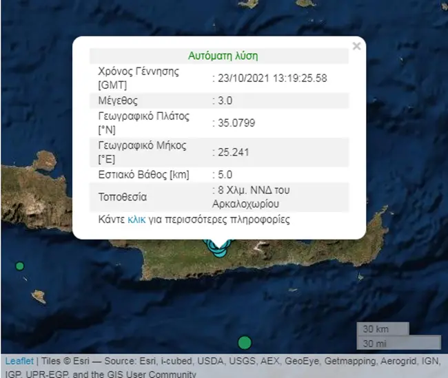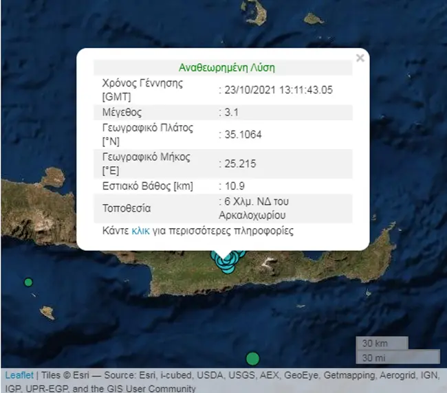 Ακόμα κουνιέται το Αρκαλοχώρι από σεισμούς που ξεκίνησαν από τον κύριο των 5,8 βαθμών της κλίμακας Ρίχτερ, της 27ης Σεπτεμβρίου. Ο Εγκέλαδος έδωσε πάλι το παρών στο Αρκαλοχώρι με δύο σεισμούς μεγέθους 3,1 και 3R με διαφορά λίγων λεπτών, στις 16:30 το απόγευμα του Σαββάτου (23.10.2021), σύμφωνα με το Γεωδυναμικό Ινστιτούτο του Εθνικού Αστεροσκοπείου Αθηνών.