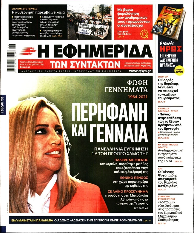 Τα πρωτοσέλιδα των ελληνικών εφημερίδων για σήμερα Τρίτη 26 Οκτωβρίου. Η τραγική απώλεια της Φώφης Γεννηματά στα 56 της χρόνια κυριαρχεί στην πρώτη του σελίδα σύσσωμου του πολιτικού Τύπου της ημέρας.