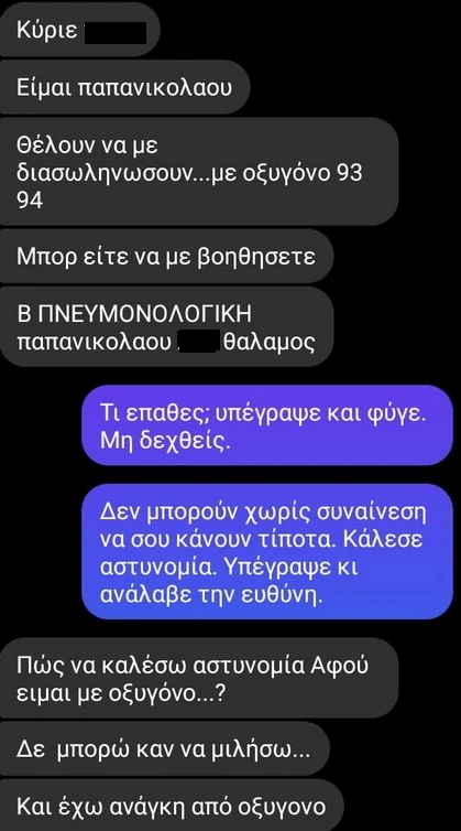 Η οδηγία προς τη νοσηλευόμενη ήταν σαφής: «Δεν μπορούν χωρίς συναίνεση να σου κάνουν τίποτα. Κάλεσε αστυνομία. Υπέγραψε και ανέλαβε την ευθύνη». Ομως, η ανεμβολίαστη ασθενής παρατηρεί: «Πώς να καλέσω την αστυνομία αφού είμαι με οξυγόνο; Δεν μπορώ καν να μιλήσω... Και έχω ανάγκη από οξυγόνο».