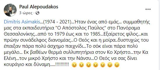 Στενός φίλος του θύματος προχώρησε σε ανάρτηση στο Facebook με την οποία αποχαιρετά τον φίλο του και πρώην συνάδελφό του και γράφει μεταξύ άλλων: «Ήταν ένας από μας... Εξαίρετος φίλος...και πρώην συνάδελφος διανομέας...Ο Θεός και η μοίρα..δυστυχώς του έπαιξαν πάρα πολύ άσχημο παιχνίδι...Το σόκ είναι πάρα πολύ μεγάλο... Εκ βαθέων θερμά συλλυπητήρια στον Κο Χρήστο...την Κα Ελένη...τον μικρό Χρήστο και την Νάνσυ...Ο Θεός να σας δίνει κουράγιο και δύναμη.....!!!!!!!!!!»