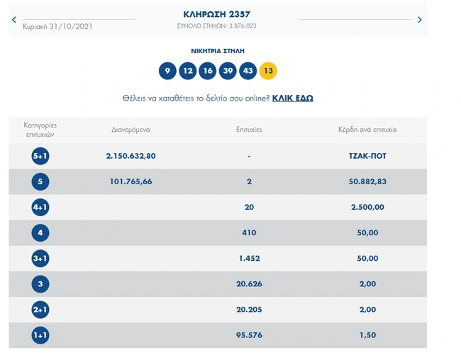 Στην κλήρωση Τζόκερ σήμερα (αριθμός κλήρωσης 2357), οι τυχεροί αριθμοί είναι: 9, 12, 16, 39, 43 και τζόκερ ο αριθμός 13.