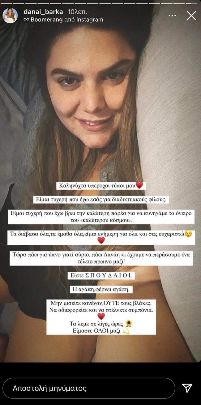 Αργά το βράδυ της Δευτέρας η Δανάη Μπάρκα έστειλε το δικό της μήνυμα μέσα από τον προσωπικό της λογαριασμό στο Instagram. Συγκεκριμένα, έγραψε: «Καληνύχτα υπέροχοι τύποι μου. Είμαι τυχερή που έχω εσάς για διαδικτυακούς φίλους. Είμαι τυχερή που έχω βρει την καλύτερη παρέα για να κυνηγάμε το όνειρο του “καλύτερου κόσμου”. Τα διάβασα όλα, τα έμαθα όλα, είμαι ενήμερη για όλα και σας ευχαριστώ. Τώρα πάω για ύπνο γιατί αύριο...πάω Δανάη κι έχουμε να περάσουμε ένα τέλειο πρωινό μαζί. Είστε σπουδαίοι. Η αγάπη, φέρνει αγάπη. Μην μισείτε κανέναν, ούτε τους βλάκες. Να αδιαφορείτε και να στέλνετε συμπόνια. Τα λέμε σε λίγες ώρες. Είμαστε όλοι μαζί».