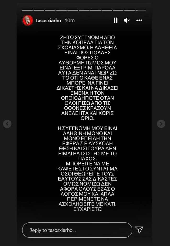 Μετά την κατακραυγή που δέχτηκε στα social media, ο Τάσος Ξιαρχό επιχείρησε να απολογηθεί αν και... μάλλον έκανε τα πράγματα χειρότερα.Ο γνωστός influencer λοιπόν απέδωσε την απαράδεκτη ενέργειά του στον... αυθορμητισμό του και φρόντισε να επιτεθεί στη συνέχεια σε όσους «τόλμησαν» να αντιδράσουν χαρακτηρίζοντάς τους ως «δικαστές»...
