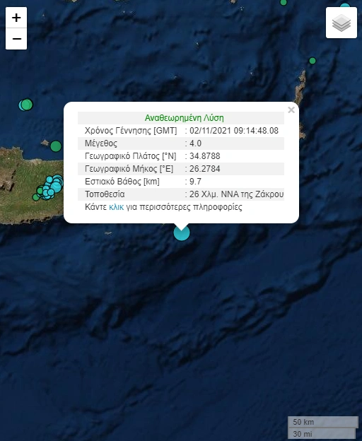 Σεισμική δόνηση μεγέθους 4,0 βαθμών της κλίμακας Ρίχτερ έγινε το πρωί της Τρίτης στην Κρήτη. Το επίκεντρο του σεισμού εντοπίζεται στα 26 χιλιόμετρα νοτιοανατολικά της Ζάκρου σε θαλάσσιο χώρο. Το εστιακό βάθος του σεισμού ήταν 9,7 χιλιόμετρα και γι αυτό έγινε ιδιαίτερα αισθητός σε μεγάλο μέρος του νησιού.