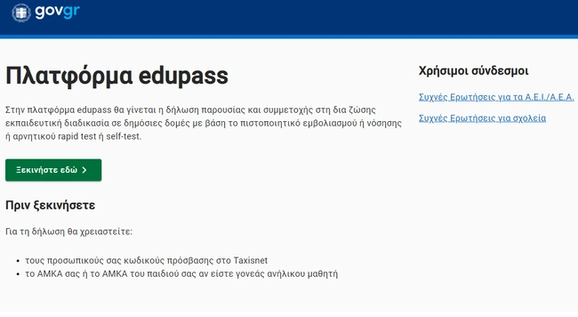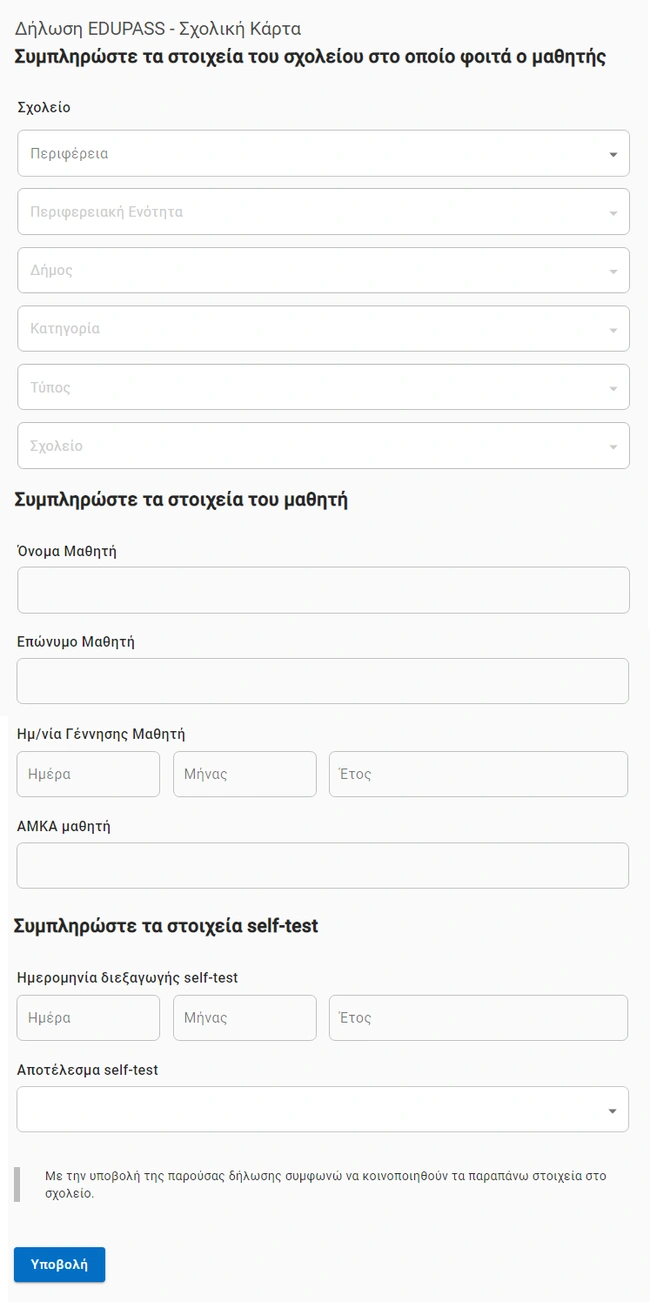 Σε λειτουργία βρίσκεται από την αρχή της εβδομάδα η πλατφόρμα edupass.gov.gr και για τους μαθητές της πρωτοβάθμιας και δευτεροβάθμιας εκπαίδευσης. Πλέον όσοι φοιτούν στα δημόσια σχολεία δηλώνουν τα self test ή οποιονδήποτε άλλο τύπο τεστ, στη συγκεκριμένη πλατφόρμα ώστε να εκδοθεί η σχολική κάρτα.