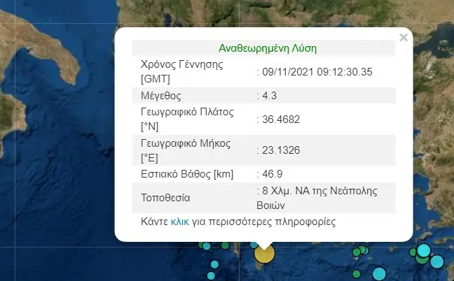 Σεισμική δόνηση μεγέθους 4,3 βαθμών της κλίμακας Ρίχτερ σημειώθηκε στη Λακωνία, 8 χιλιόμετρα νοτιοανατολικά της Νεάπολης Βοιών. Το εστιακό βάθος του σεισμού, σύμφωνα με το Γεωδυναμικό Ινστιτούτο, εντοπίζεται στα 46,9 χιλιόμετρα.