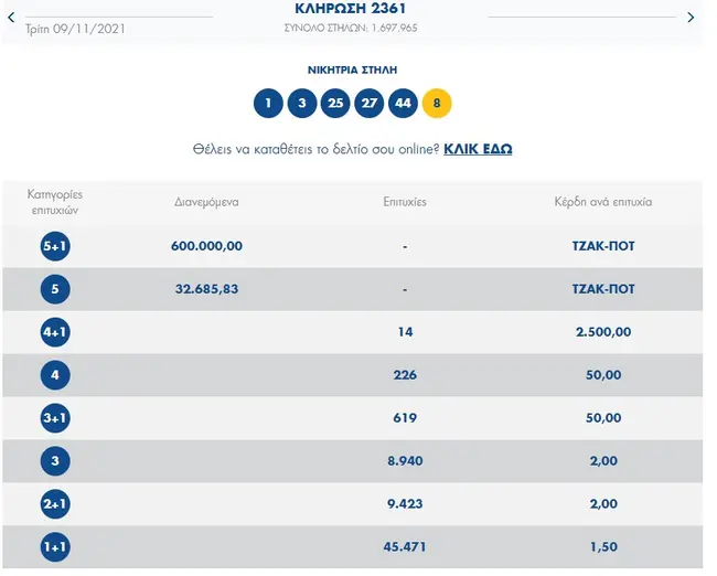 Τουλάχιστον 600.000 ευρώ μοιράζει απόψε, Τρίτη 9 Νοεμβρίου, το Τζόκερ στους νικητές της πρώτης κατηγορίας. Στην κλήρωση Τζόκερ σήμερα (αριθμός κλήρωσης 2357), οι τυχεροί αριθμοί είναι:3,44, 25, 1, 27 και Tζόκερ ο αριθμός 8.