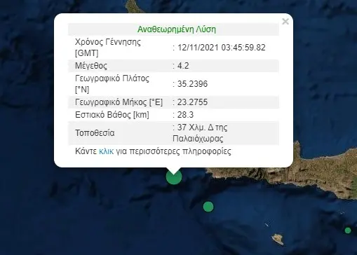 Σεισμός μεγέθους 4,3 της κλίμακας Ρίχτερ σημειώθηκε στις 5:45 τα ξημερώματα της Παρασκευής, 12 Νοεμβρίου, 42 χλμ δυτικά της Παλαιόχωρας στο νομό Χανίων της Κρήτης. Το εστιακό βάθος του σεισμού ήταν 17,5 χλμ.