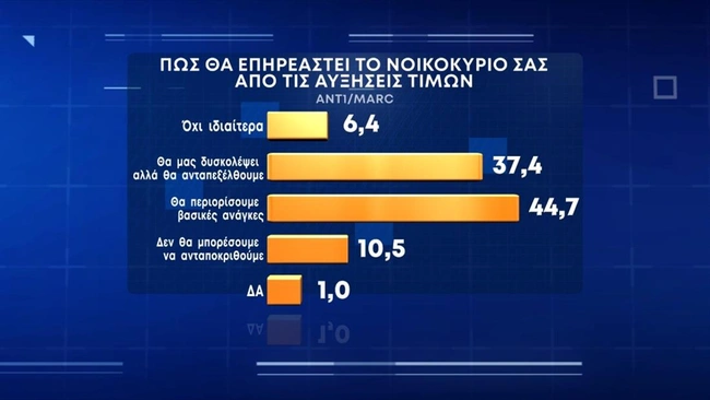 Τέλος, σε ότι αφορά την επίδραση της ενεργειακής κρίσης στον οικογενειακό προϋπολογισμό των νοικοκυριών, το 6,4% απάντησε ότι το νοικοκυριό δεν θα επηρεαστεί ιδιαίτερα από τις αυξήσεις, το 37,4% ότι οι ανατιμήσεις θα δυσκολέψουν την κατάσταση, αλλά το νοικοκυριό θα μπορέσει να ανταπεξέλθει σε αυτές. Ωστόσο, το 44,7% των ερωτηθέντων είπε ότι θα αναγκαστεί να περιορίσει αγαθά για την κάλυψη βασικών αναγκών και ποσοστό 10.5% ότι δεν θα μπορέσει καθόλου να ανταποκριθεί στις βασικές ανάγκες του, μετά τις αυξήσεις στις τιμές υπηρεσιών και αγαθών.