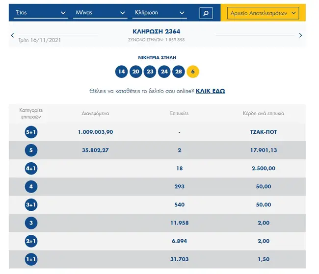 Σήμερα, Τρίτη 16 Νοεμβρίου 2021, στην κλήρωση 2364 Τζόκερ του ΟΠΑΠ, θα μοιραστούν στους τυχερούς της πρώτης κατηγορίας τουλάχιστον 1.000.000 ευρώ.