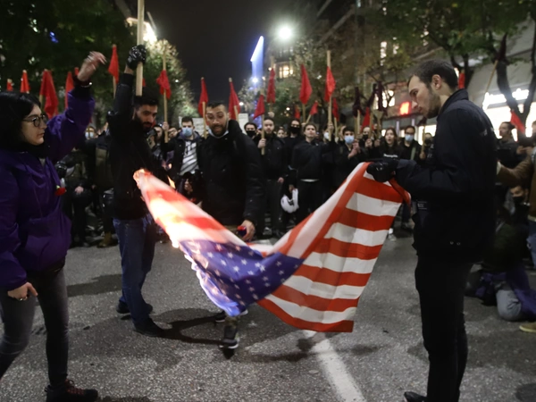 Νωρίτερα, διαδηλωτές στη Θεσσαλονίκη τραγούδησαν το «Πότε θα κάνει Ξαστεριά» και το «Ακορντεόν», ενώ έβαλαν φωτιά σε αμερικανική σημαία, σύμφωνα με το voria.gr.