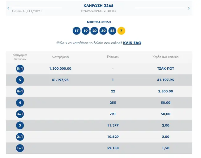 Σήμερα, Πέμπτη 18 Νοεμβρίου 2021, στην κλήρωση 2365 Τζόκερ του ΟΠΑΠ, θα μοιραστούν στους τυχερούς της πρώτης κατηγορίας τουλάχιστον 1.300.000 ευρώ.