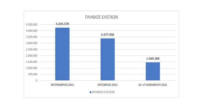 Σύμφωνα με τα διαγράμματα που παρουσίασε ο Διοικητής της Εθνικής Αρχής Διαφάνειας Άγγελος Μπίνης, τον Νοέμβριο έχουν διεξαχθεί 1.469.269 έλεγχοι ενώ έχουν καταγραφεί 5.994 παραβάσεις με το ποσοστό να βρίσκεται στο 0,41%. Την ίδια στιγμή το αντίστοιχο ποσοστό τον Οκτώβριο ήταν 0,25% και τον Σεπτέμβριο 0,21%.