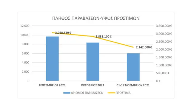 Συνολικά μέσα στο Φθινόπωρο, και μέχρι τις 17/11, έχουν πραγματοποιηθεί 9.092.804 έλεγχοι με τις παραβάσεις να ανέρχονται στις 24.000 και τα πρόστιμα στα 8.042.239 ευρώ. Παράλληλα έχει επιβληθεί αναστολή λειτουργίας σε 601 επιχειρήσεις.