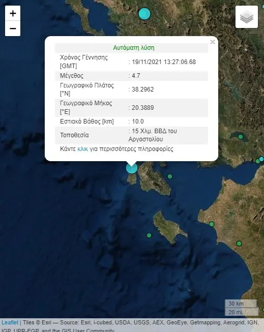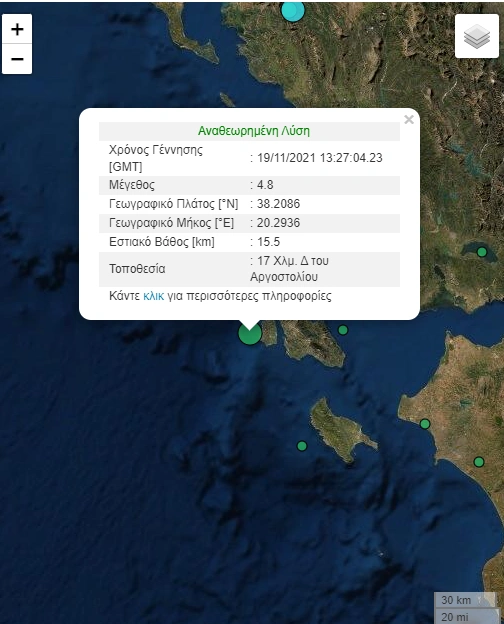 Ισχυρή σεισμική δόνηση σημειώθηκε στις 3:27 το μεσημέρι στην Κεφαλονιά κι έγινε ιδιαίτερα αισθητός σε όλο το νησί. Το επίκεντρο εντοπίζεται 17,5 χιλιόμετρα δυτικά του Αργοστολίου, ενώ το εστιακό βάθος υπολογίζεται στα 15,5 χιλιόμετρα. Σύμφωνα με την αναθεωρημένη λύση του Γεωδυναμικού Ινστιτούτου Αθηνών, ο σεισμός ήταν μεγέθους 4,8 Ρίχτερ, ενώ η αυτόματη λύση έδινε τον σεισμό στα 4,7 Ρίχτερ.