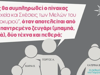 Σε ένα άλλο μήνυμα στο μέσο κοινωνικής δικτύωσης περιγράφεται με ένα παράδειγμα πώς συμπληρώνουμε τον πίνακα «Στοιχεία και Σχέσεις των Μελών του Νοικοκυριού». Το παράδειγμα αφορά ένα νοικοκυριό που αποτελείται από ένα παντρεμένο ζευγάρι (μπαμπά, μαμά), δύο παιδιά και πεθερά.