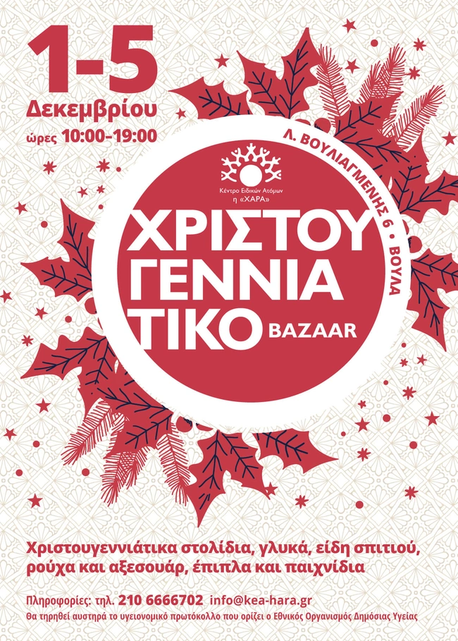 Το Κέντρο Ειδικών Ατόμων η «Χαρά» προσκαλεί μικρούς και μεγάλους από 1 - 5 Δεκεμβρίου να δώσουν το παρών στην χριστουγεννιάτικη γιορτή που πραγματοποιείται με σκοπό την ενίσχυση του και προς όφελος των παιδιών που βρίσκονται σε ανάγκη. Εθελοντές και φίλοι του Κέντρου έχουν βάλει τα δυνατά τους για να προσφέρουν, σε όσους βρεθούν στην εκδήλωση, σπιτικά γλυκά, χειροποίητα στολίδια, κοσμήματα και γούρια, ρούχα και αξεσουάρ, σε ιδιαίτερα χαμηλές τιμές.