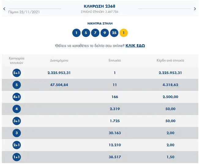 Σήμερα, Πέμπτη 25 Νοεμβρίου 2021, στην κλήρωση 2368 Τζόκερ του ΟΠΑΠ, θα μοιραστούν στους τυχερούς της πρώτης κατηγορίας τουλάχιστον 2.222.222 ευρώ.