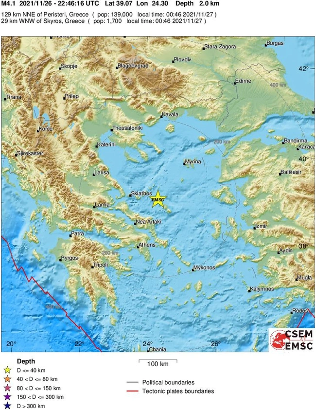 Σεισμική δόνηση μεγέθους 4,1 βαθμών της κλίμακας Ρίχτερ σημειώθηκε στις 00:46 στη Σκύρο. Ο σεισμός είχε ως επίκεντρο τη θαλάσσια περιοχή 29 χιλιόμετρα δυτικά – βορειοδυτικά της Σκύρου και είχε εστιακό βάθος μόλις δυο χιλιόμετρα.
