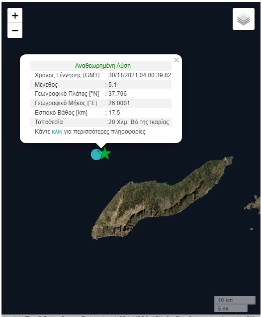 Ισχυρός σεισμός τα ξημερώματα της Τρίτης ανοικτά της Ικαρίας. Συγκεκριμένα στις 6πμ σημειώθηκε σεισμική δόνηση μεγέθους 5,1 βαθμών της κλίμακας Ρίχτερ με τα πρώτα στοιχεία να αναφέρουν επίκεντρο 20χλμ βορειοδυτικά της Ικαρίας. Εννέα λεπτά αργότερα σημειώθηκε και νέος ισχυρός σεισμός μεγέθους 4 βαθμών της κλίμακας Ρίχτερ επίσης στο ίδιο σημείο, βορειοδυτικά του νησιού.