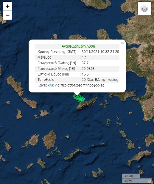 Νέα σεισμική δόνηση κατέγραψαν οι σεισμογράφοι του Γεωδυναμικού Ινστιτούτου Αθηνών στην Ικαρία, με το μέγεθος του σεισμού να υπολογίζεται στα 4,1 Ρίχτερ. Ο σεισμός έγινε στις 12:32 το μεσημέρι και είχε εστιακό βάθος 16,5 χιλιόμετρα. Το ακριβές επίκεντρο, εντοπίζεται σε θαλάσσιο χώρο 20 χιλιόμετρα βορειοδυτικά της Ικαρίας.