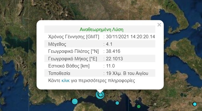 Σε μία ημέρα που ο Εγκέλαδος δεν λέει να μας... αφήσει ήσυχους, νέα σεισμική δόνηση σημειώθηκε, αυτή τη φορά στο Αίγιο. Ο σεισμός σημειώθηκε στις 16:20 και ήταν μεγέθους 4,1 βαθμών της κλίμακας Ρίχτερ, ενώ το επίκεντρο ήταν 19 χιλιόμετρα βόρεια της πόλης της Αχαΐας, σύμφωνα με την Αναθεωρημένη Λύση του Γεωδυναμικού Ινστιτούτου. Ο σεισμός είχε εστιακό βάθος 11 χιλιόμετρα.