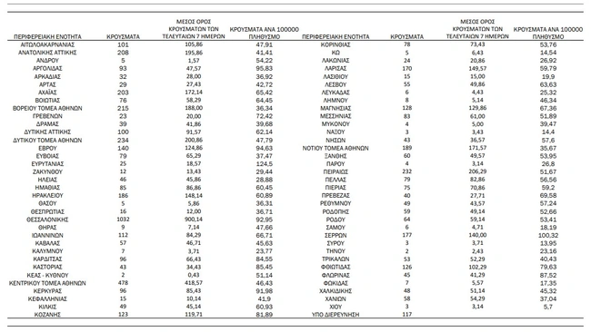 Από τα 6.201 κρούσματα τα 1.699 εντοπίστηκαν στην Αττική και τα 1.032 στη Θεσσαλονίκη. Στην Αχαΐα ανιχνεύτηκαν 203 κρούσματα, στο Ηράκλειο 186, στις Σέρρες 177 και στη Λάρισα 170. Επίσης στον Έβρο ο αριθμός των νέων κρουσμάτων ανέρχεται σε 140, στη Μαγνησία 128, στη Φθιώτιδα 126, στην Κοζάνη 123, στα Ιωάννινα 112 και στην Αιτωλοακαρνανία 101.