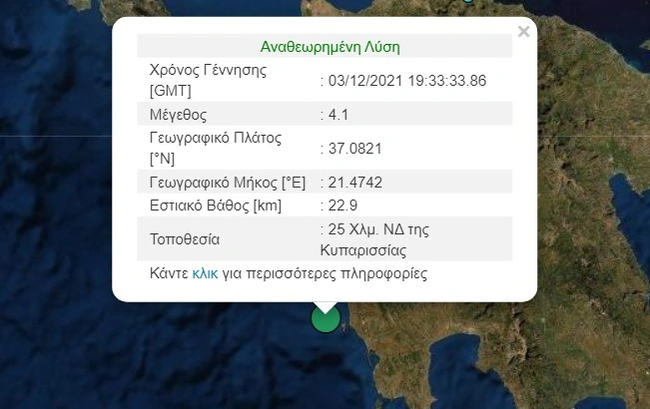 Σεισμική δόνηση μεγέθους 4,1 βαθμών της κλίμακας Ρίχτερ σημειώθηκε στις 21:33, το βράδυ της Παρασκευής (3/12), 25 χιλιόμετρα νοτιοδυτικά της Κυπαρισσίας, σύμφωνα με το Γεωδυναμικό Ινστιτούτο.