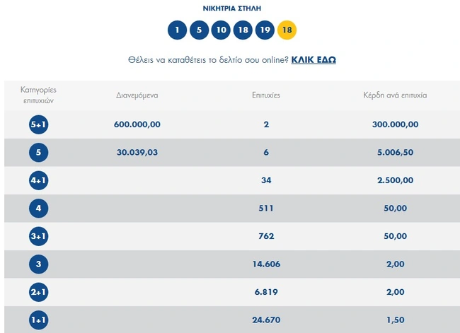 Οι τυχεροί αριθμοί στη σημερινή κλήρωση Τζόκερ είναι οι εξής: 18, 19, 10, 5, 1 και Tζόκερ ο αριθμός 18.