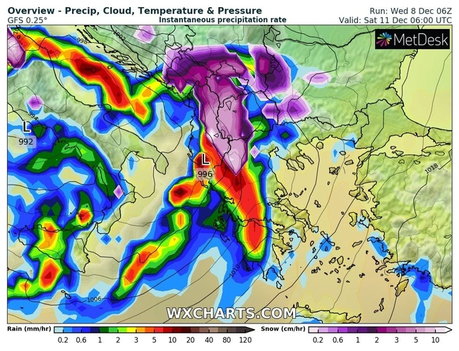 Παράλληλα, η έγκυρη ιστοσελίδα forecastweather επισημαίνει πως το Σάββατο (11/12) τα ακραία καιρικά φαινόμενα θα γίνουν ορατά κυρίως στη Δυτική Ελλάδα, ενώ ισχυρές βροχές και καταιγίδες θα έχουμε σε Ήπειρο, Πελοπόννησο, Νησιά Ιονίου, Θρακη, Δυτική Στερεά, Δυτική Θεσσαλία ( Ν.Καρδίτσας, Ν.Τρικώλων).