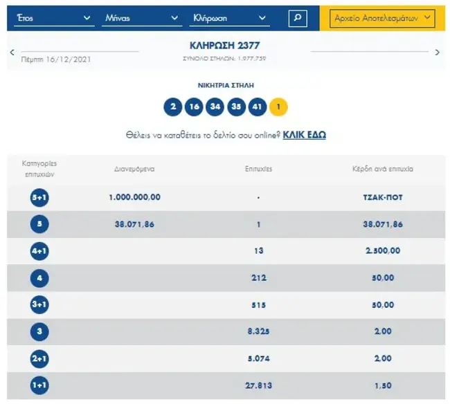 Σήμερα, Πέμπτη 16 Δεκεμβρίου 2021, στην κλήρωση 2377 Τζόκερ του ΟΠΑΠ, θα μοιραστούν στους τυχερούς της πρώτης κατηγορίας 1.000.000 ευρώ.