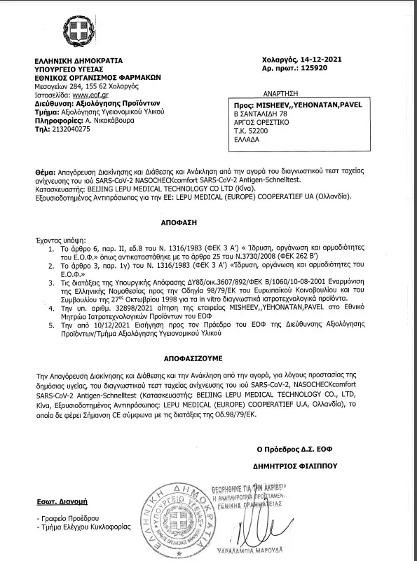 Στην ανάκληση self test προχώρησε ο Εθνικός Οργανισμός Φαρμάκων (ΕΟΦ) για λόγους προστασίας της δημόσιας υγείας. Συγκεκριμένα, ο ΕΟΦ αποφάσισε την απαγόρευση διακίνησης και διάθεσης καθώς και ανάκλησης από την αγορά, για λόγους προστασίας της δημόσιας υγείας, του διαγνωστικού τεστ ταχείας ανίχνευσης του κορονοϊού NASOCHECKcomfort SARS-CoV-2 Antigen-Schnelltest.