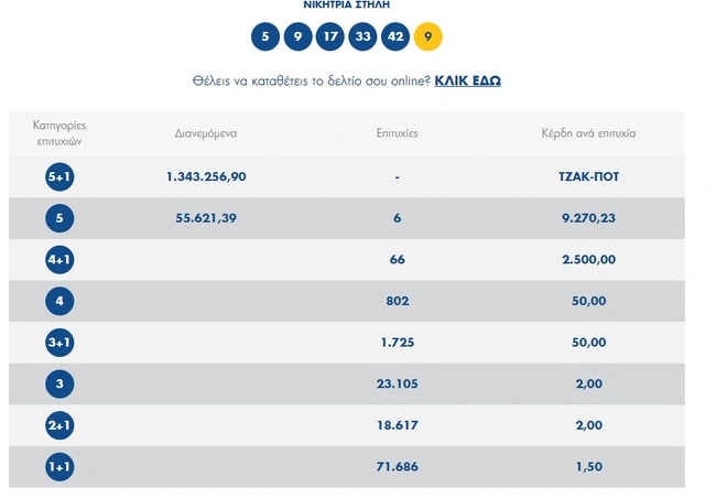 Οι τυχεροί αριθμοί στη σημερινή κλήρωση Τζόκερ είναι οι εξής: 5, 9, 42, 17, 33 και Tζόκερ ο αριθμός 9.