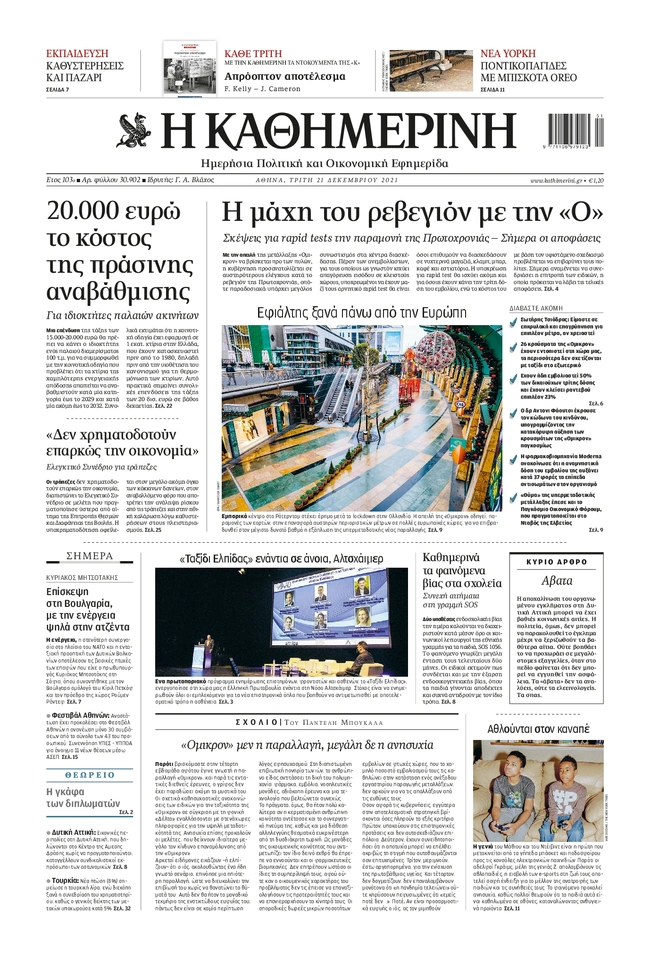 Τα πρωτοσέλιδα των ελληνικών εφημερίδων για σήμερα Τρίτη 21 Δεκεμβρίου. Δείτε τι φιλοξενεί στην πρώτη του σελίδα ο πολιτικός και οικονομικός Τύπος και τα θέματα της επικαιρότητας που ξεχωρίζουν.