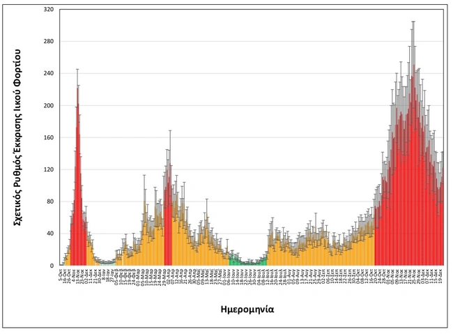 Όπως αποτυπώνεται στα διαγράμματα που παρουσιάζει το ΑΠΕ-ΜΠΕ, μετά από τρεις εβδομάδες έχει ανακοπεί η ήπια αποκλιμάκωση του ιικού φορτίου, που είχε διαρκέσει τρεις εβδομάδες μετά το σημείο κορύφωσης του τέταρτου κύματος την 25η Νοεμβρίου.