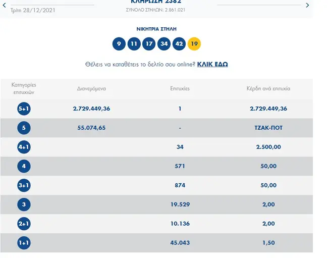 Ο υπερτυχερός δεν έπαιξε κάποιο σύστημα καθώς είχε απλή συμμετοχή το δελτίο του και με τους έξι μαγικούς αριθμούς έγινε πλουσιότερος κατά 2,7 εκατομμύρια ευρώ. Υπενθυμίζεται ότι οι αριθμοί που κληρώθηκαν ήταν: 9,11,17,34,42 και τζόκερ το 19.