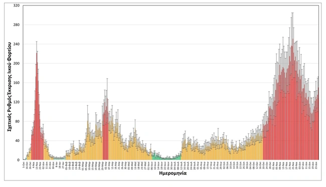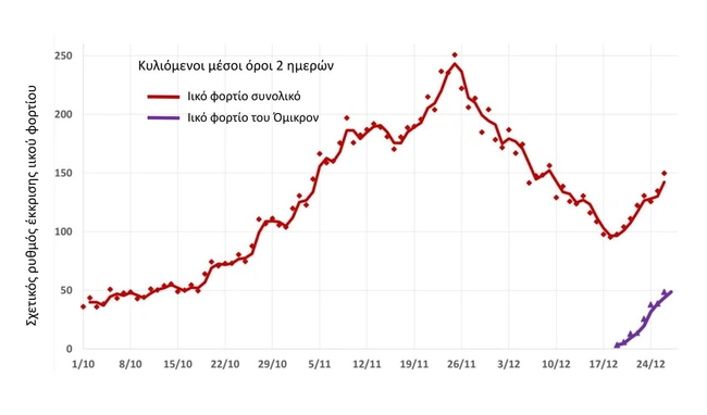 Όπως φαίνεται στα διαγράμματα που παρουσιάζει το ΑΠΕ-ΜΠΕ, το τέταρτο κύμα της πανδημίας κορυφώθηκε στις 25 Νοεμβρίου και την αργή αποκλιμάκωση τις τρεις εβδομάδες που ακολούθησαν διαδέχθηκε -με το ιικό φορτίο ακόμη σε βαθύ «κόκκινο»- μία απότομη αύξηση, η οποία σηματοδοτεί και την αρχή του πέμπτου κύματος της πανδημίας. Η αναστροφή της πορείας αποκλιμάκωσης συνέπεσε χρονικά με την εμφάνιση στα λύματα του στελέχους Όμικρον, στις 19 Δεκεμβρίου, και από την ημέρα εκείνη η γραμμή της ανόδου του συνολικού ιικού φορτίου είναι παρόμοια με την αντίστοιχη γραμμή ανόδου του Όμικρον.